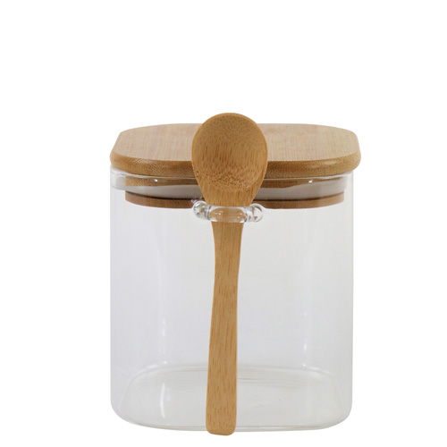 BARATTOLO IN VETRO TRASPARENTE TAPPO IN LEGNO CHIUSURA ERMETICA CUCCHIAIO DOSATORE IN LEGNO USO ALIMENTARE SCATOLA BIANCA