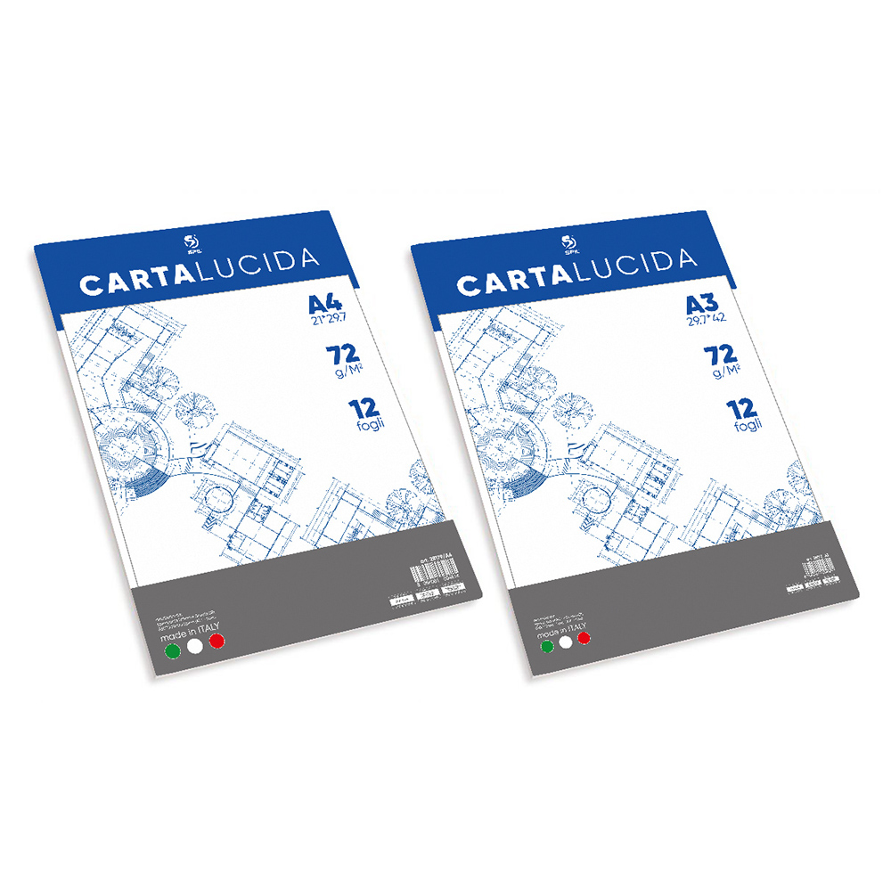Blocco carta lucida satinata per disegno tecnico contenente 12 fogli da 72 grammi, disponibile in formato A3 e A4.