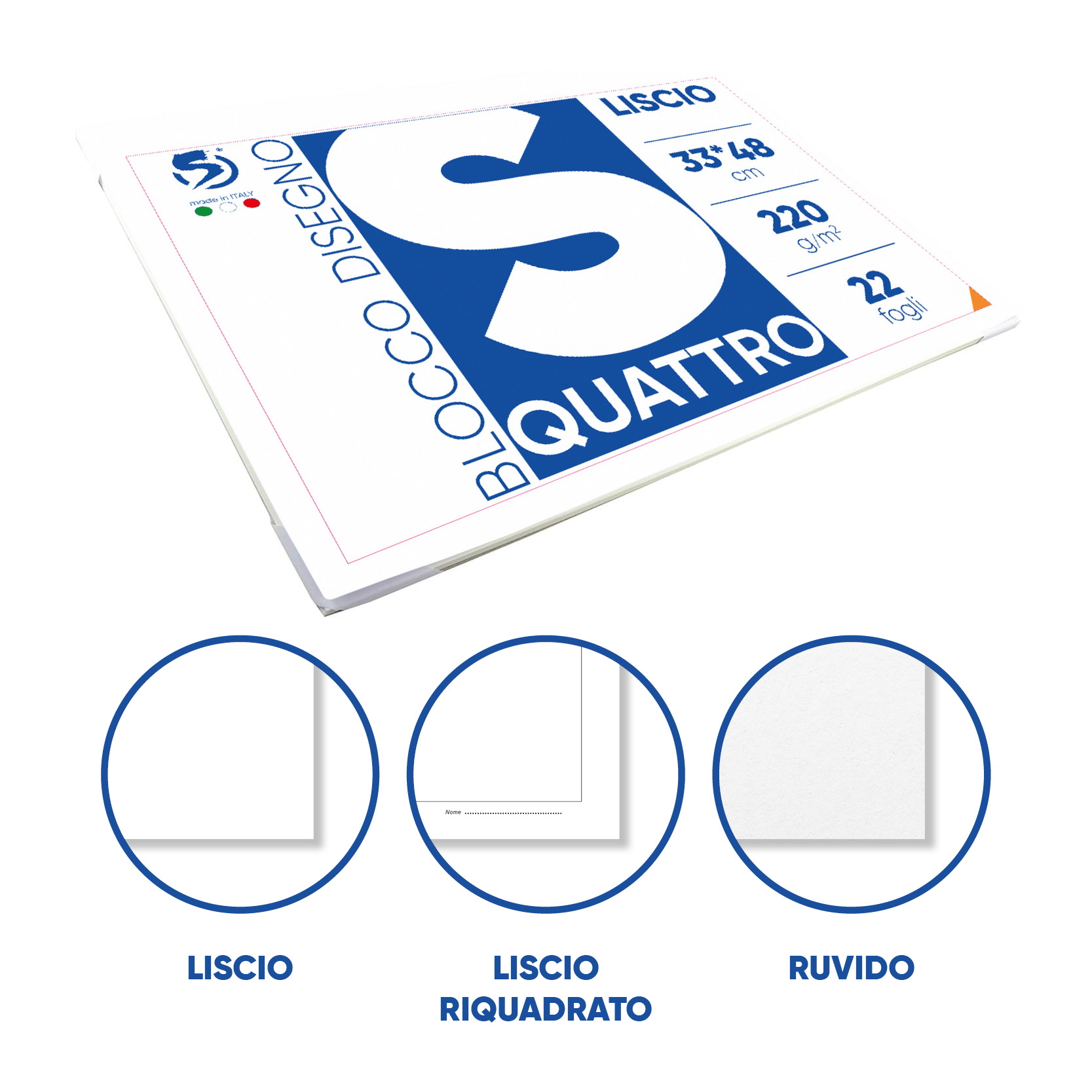 Blocco disegno: 22 fogli, carta bianca 220 grammi per superficie liscia e riquadrata, carta 200 grammi per superficie ruvida. Particolarmente indicata per studenti di istituti tecnici e per l’uso professionale di grafici, architetti e geometri, disponibile liscia, ruvida e riquadrata