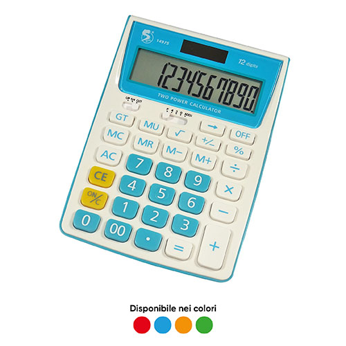 Calcolatrice da banco 12 cifre, con display inclinato per visione facilitata, doppia alimentazione e tasti XL. Formato 186 x 134 x 40.5 mm. Disponibile nei colori azzurro, arancio, fucsia e verde. Garanzia 2 anni.
