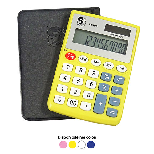 Calcolatrice tascabile 12 cifre, chiusura a libretto in PVC, doppia alimentazione e tasti gommati. Formato 96 x 63 x 10 mm. Disponibile nei colori rosa, giallo. bianco e blu. Garanzia 2 anni.