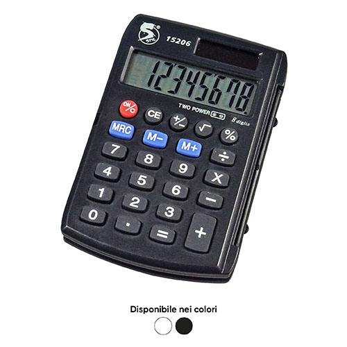 Calcolatrice tascabile 8 cifre, con custodia rigida, doppia alimentazione e tasti gommati. Formato 96 x 63 x 12 mm. Disponibile in bianco o nero. Garanzia 2 anni.