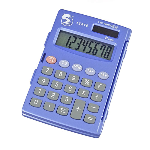 Calcolatrice tascabile 8 cifre, con custodia rigida, doppia alimentazione e tasti gommati. Formato 105 x 65 x 9 mm. Garanzia 2 anni.