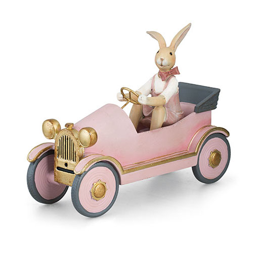 CONIGLIO RESINA ROSA CON RIFINITURE ORO SU MACCHINA 24.5 x 19 cm USO DECORATIVO 25351