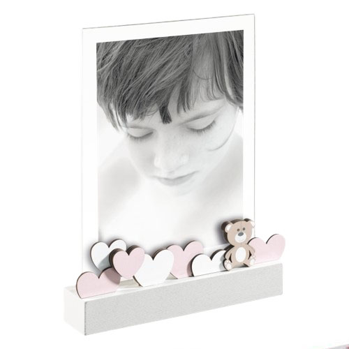 Portafoto in acrilico con base autoportante in legno, con decori in rilievo su piu’ livelli. Per foto verticale. Formato esterno: 15×20, cornici di qualità.