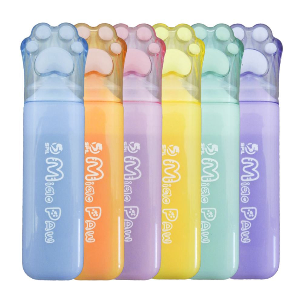 SPIL – Evidenziatori con tappo a forma di zampina di gatto. Disponibile in 6 colori diversi: Verde – Viola – Giallo – Arancio – Azzurro – Rosa