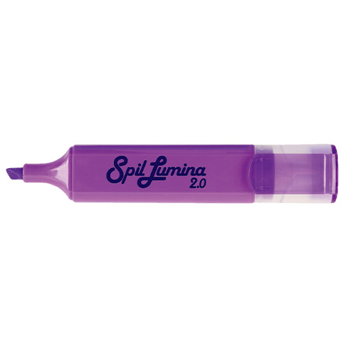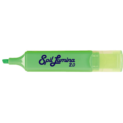 SPIL – Evidenziatore punta a scalpello, tappo con clip, 3g di colore. Disponibili in 6 colori fluo: Verde – Rosa – Lilla – Giallo – Arancione – Azzurro. Tappo in tinta con il fusto dell’evidenziatore. Evidenzia in maniera nitida