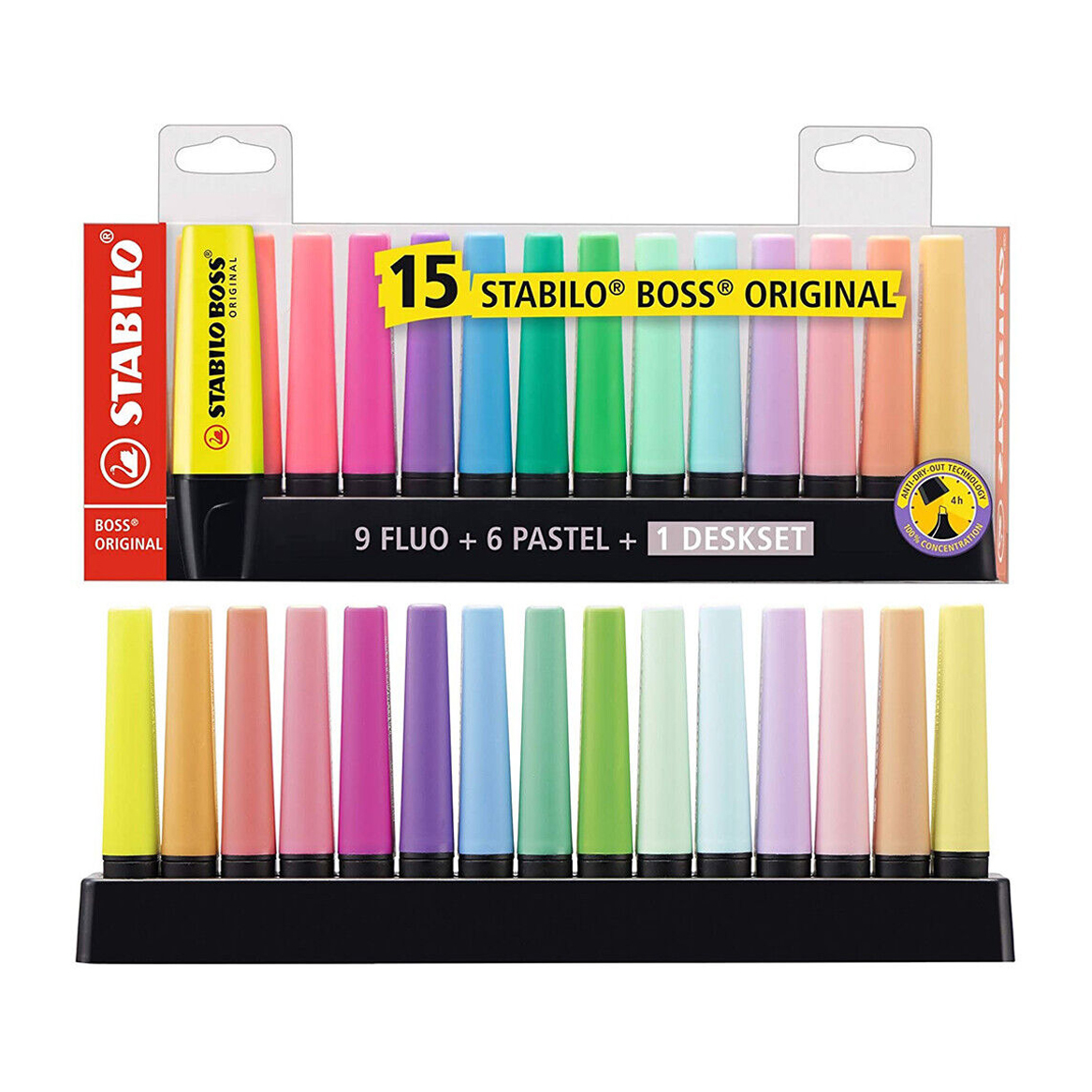 Evidenziatore stabilo boss set da scrivania contiene 15 pezzi assortiti in 9 colori fluorescenti + 6 colori pastello