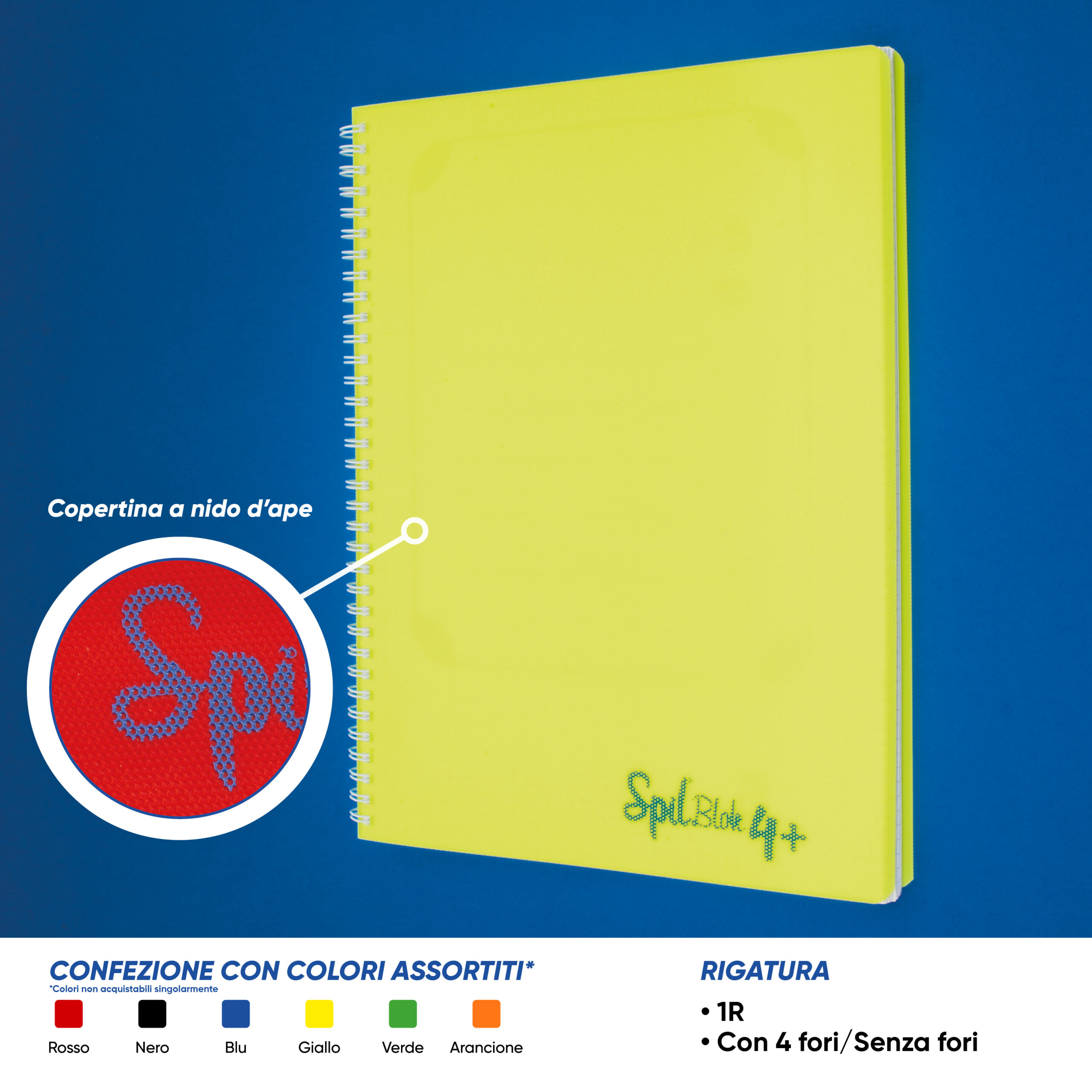 SPIL – Quaderno formato 22.5 x 29.7, copertina in PP a nido d’ape, cartoncino posteriore 900 grammi, spirale in metallo plastificato, 80 fogli di carta 80 grammi. Con il loro formato da 225 MM offrono un’ampia superficie di scrittura. Quando è necessario strappare un foglio, il formato utile rimane 210 x 297 MM (A4). Disponibile con o senza fori. Rigatura: 1Rigo