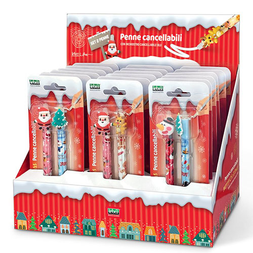 Set Blister di 2 penne cancellabili a scatto con top fantasia Christmas in espositore da 18 set.
