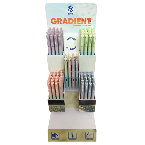Penne Gradient Silent Clicker Gel Pen dall’inchiostro nero e doppia punta a sfera da 0.5 mm. Fusto soft touch con foro per vedere il livello dell’inchiostro, scatto silenzioso.