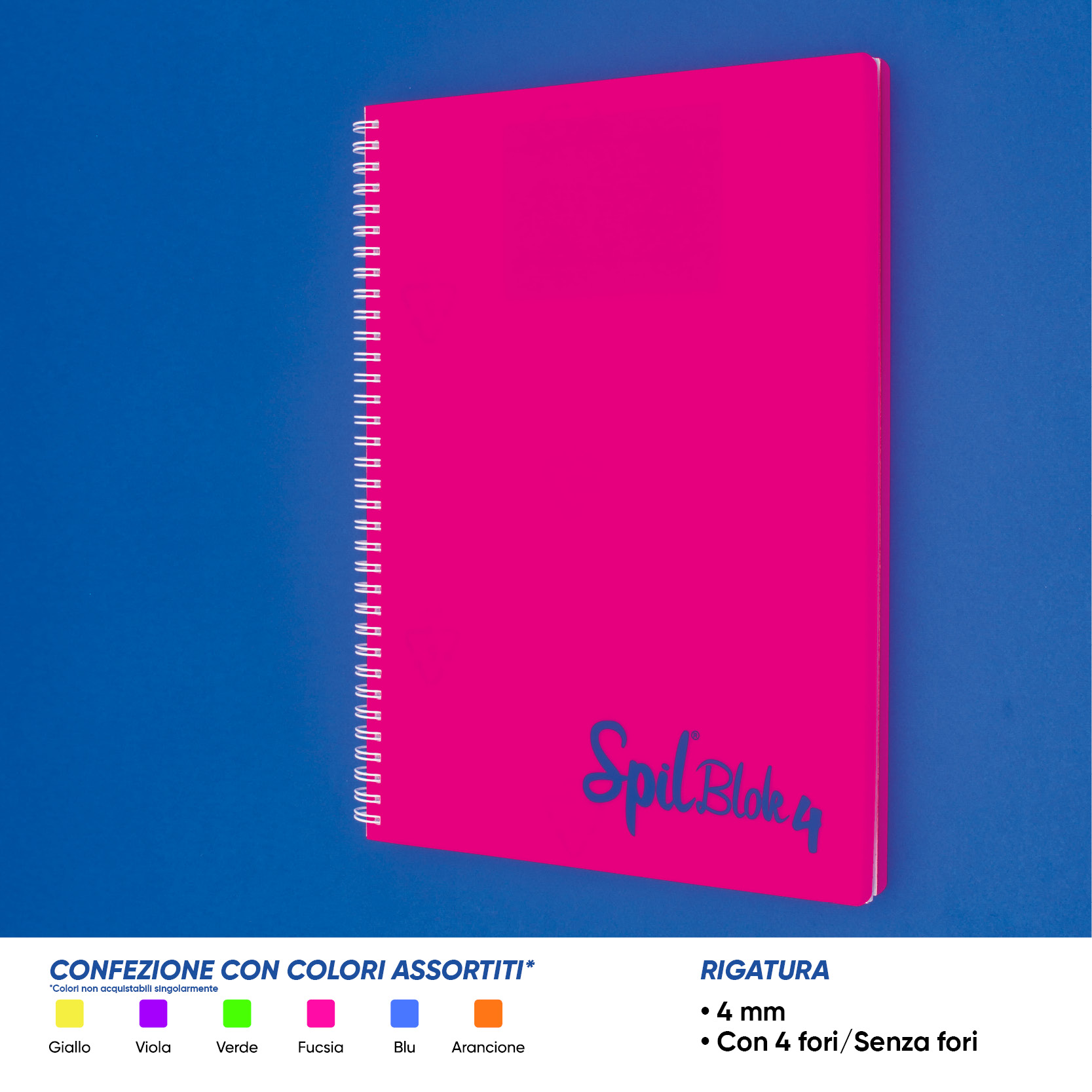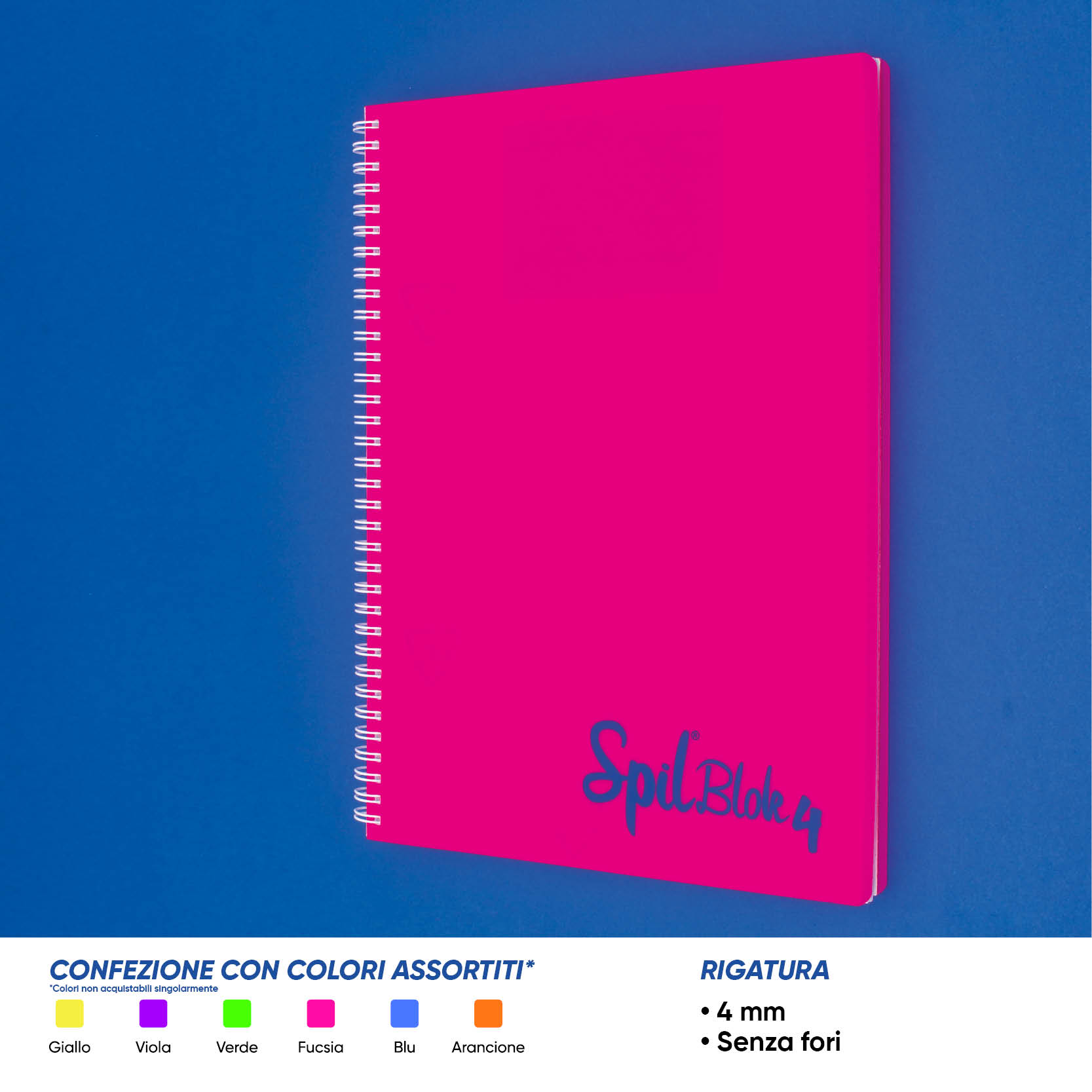 Spil Maxi spiralato A4, copertina in PP, cartoncino posteriore 900 grammi, spirale in metallo plastificato, 80 fogli di carta 80 grammi. Disponibile con o senza fori. Ideale per le scuole superiori e università. Colori Fluo. Rigatura: 4Millimetri