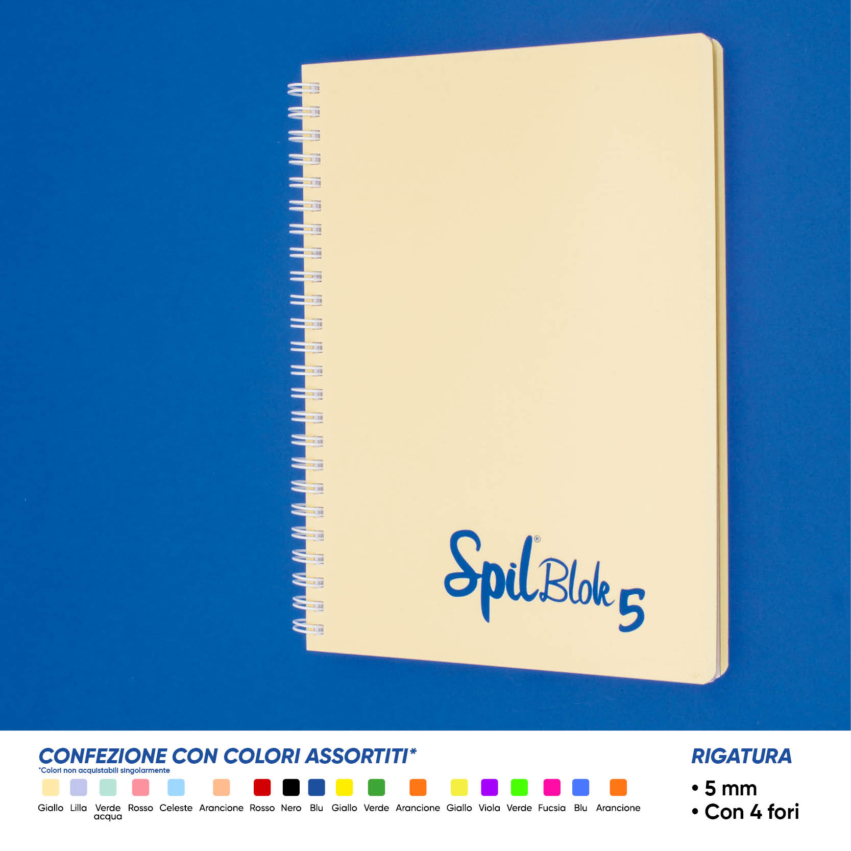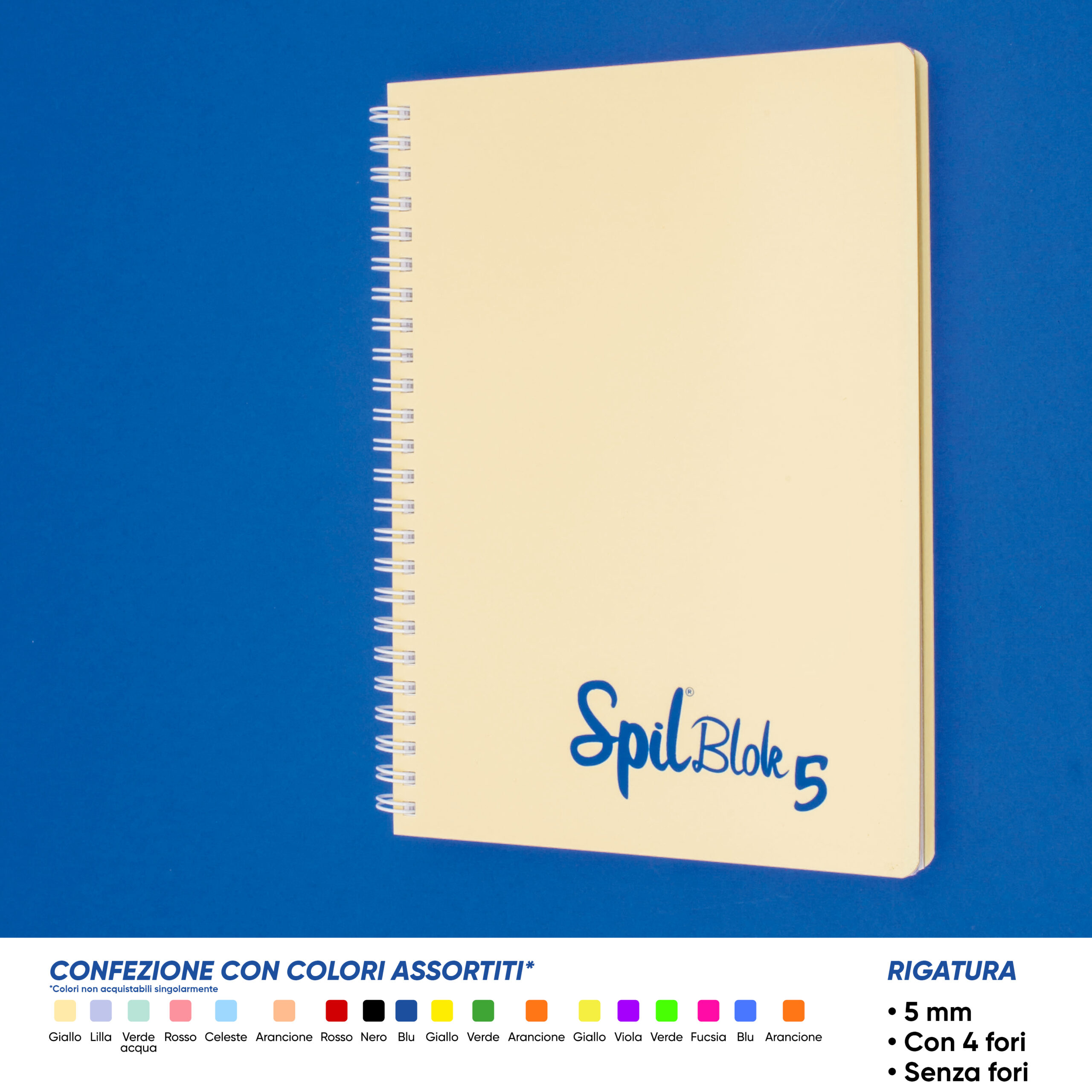 SPIL – Quaderno formato A5, copertina in PP, cartoncino posteriore 900 grammi, spirale in metallo plastificato, 80 fogli di carta 80 grammi. Disponibile con o senza fori. RIGATURA: 5MM. Ideale per l’università