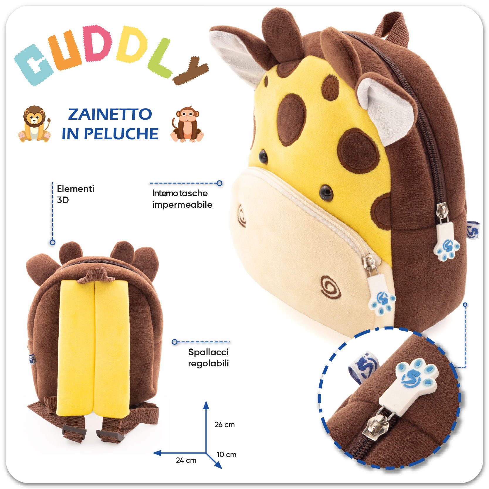 Zainetti: Spil Zainetto Cuddly con tasche interne impermeabili, spallacci regolabili, elementi in 3D. 15 Fantasi5: Cane – Coccinella – Farfalla – Giraffa – Granchio – Gufo – Ippopotamo – Koala – Leone – Panda – Pinguino – Scimmia – Squalo – Unicorno – Volpe