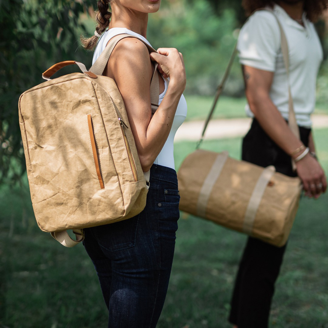 Zaino ECO PAPERLINE 26,5x10x57cm per tempo libero, scuola, università, con vano porta laptop, PC, iPad. In carta kraft lavabile, zip in plastica e linguetta in pelle Pu, interno in cotone, maniglie in cotone-poliestere. Disponibile nei colori brown e tan.